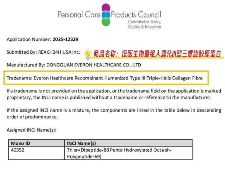 恒医生物自主研发创新原料 Everon Healthcare Recombinant Humanized Type III Triple-Helix Collagen Fibre(恒医生物重组人源化III型三螺旋胶原蛋白)成功通过国际化妆品原料命名委员会(INC)审核,正式获得INCI名称备案,是全球首个以“III型三螺旋结构胶原蛋白”被收录的胶原蛋白,标志着该原料在国际化妆品成分识别体系中获得权威身份认证。